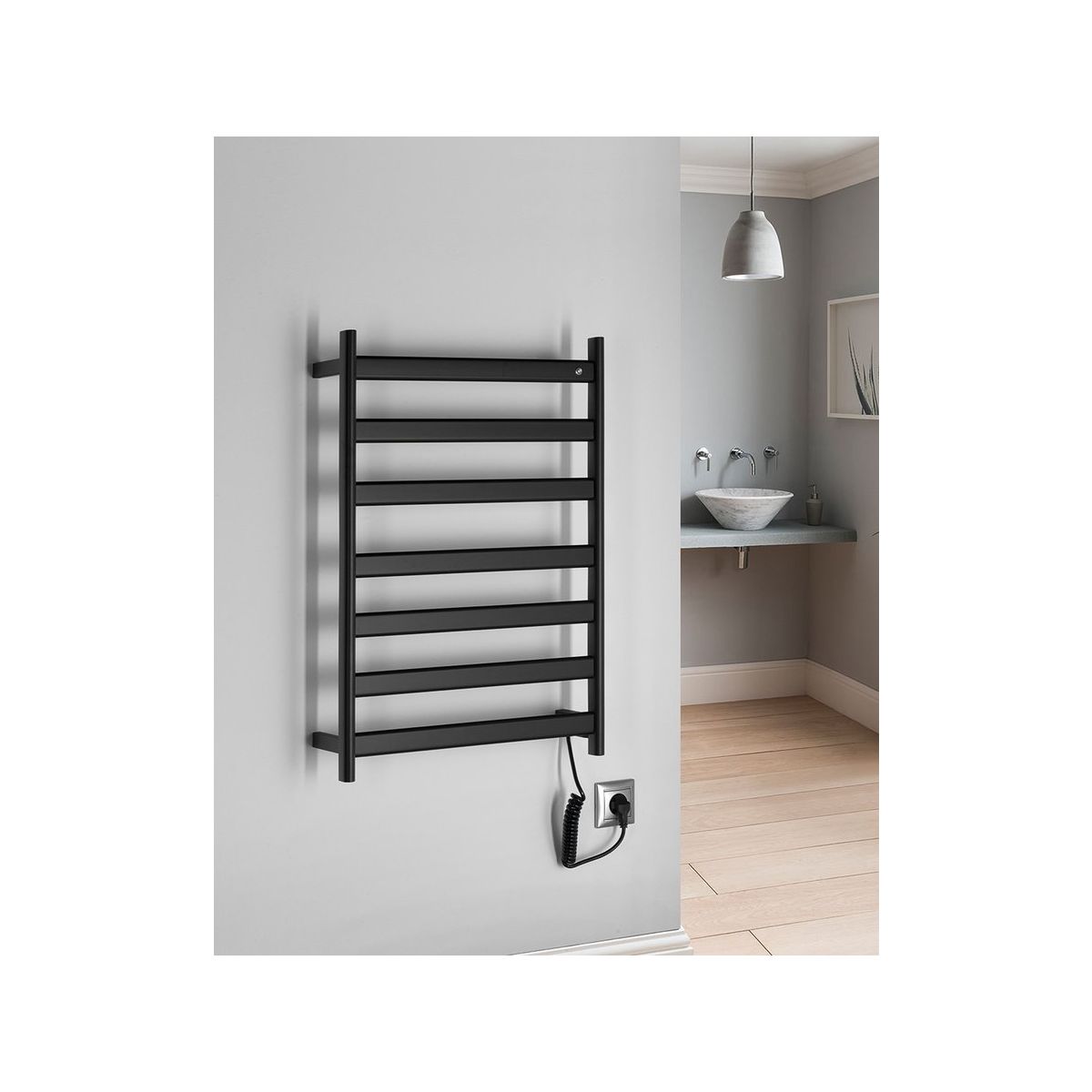 Uscătoarele electrice ELIAS din oțel inoxidabil lăcuit sunt concepute pentru a încălzi și usca prosoapele, apreciate mai ales în timpul sezonului de iarnă. Interiorul încălzitorului este realizat din fibră de carbon (nu este necesar să fie umplut cu niciun lichid), ceea ce asigură o conductivitate termică excelentă. Întrerupătorul iluminat este integrat în colțul din dreapta sus.