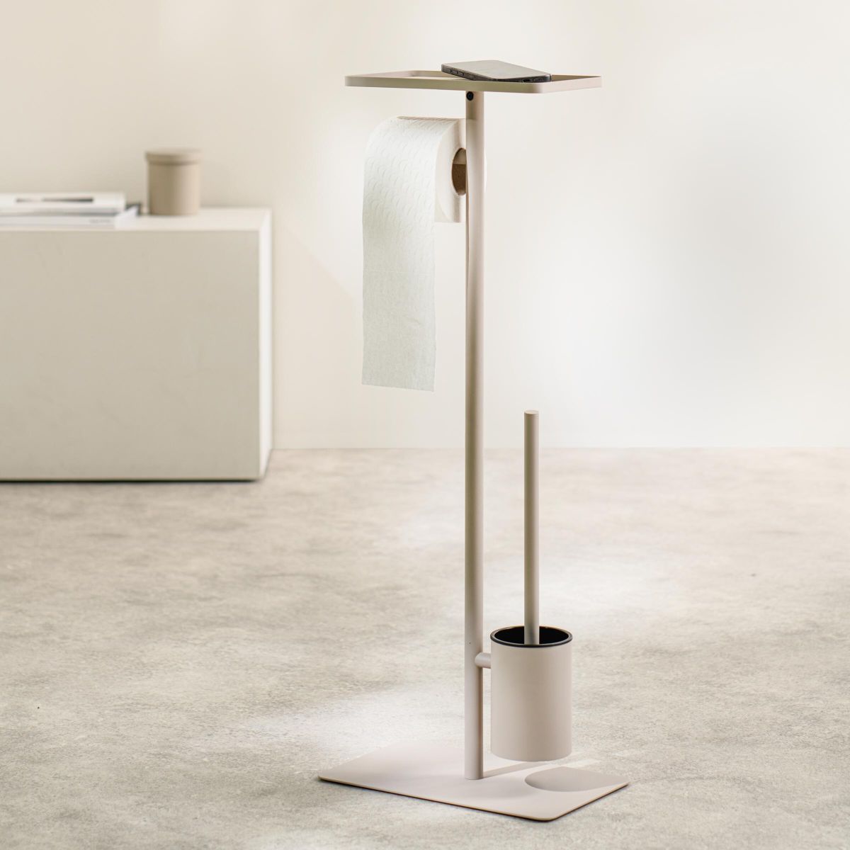 Suport multifuncțional pentru toaletă cu suport pentru hârtie, perie și raft – stil și confort în culoarea cașmir