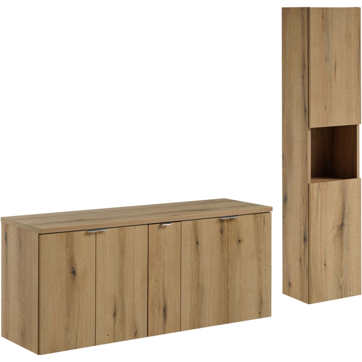 Cu o lățime de 140 cm și o adâncime de 40 cm, setul de baie SET-NOA B OAK 140CM D HC este soluția perfectă pentru baia dumneavoastră. Setul este format din 5 piese în culoarea Coastal Oak Evoke, care adaugă eleganță și modernitate interiorului. Fronturile cu textură netedă creează un ansamblu coerent, în timp ce mânerele cromate lucioase adaugă o notă modernă.