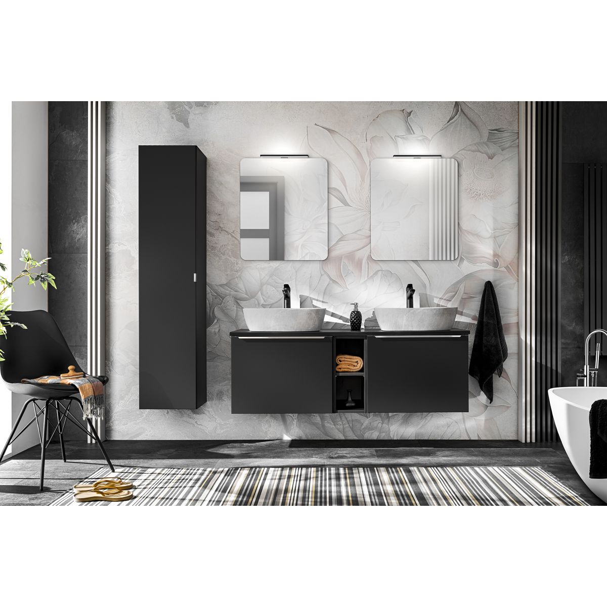 Santa Fe Black sunt solide proiectate într-un stil modern, astfel încât se vor integra cu ușurință în aproape orice aranjament. Fronturile și corpul în culoarea orhideei negre combinate cu mânerele cromate fac ca întregul aspect să fie ușor și elegant. Dulapurile cu oglindă incluse în colecție măresc optic baia și oferă spațiu suplimentar de depozitare. Mobilierul de baie din colecția Santa Fe Black este confortabil de utilizat și funcțional. Colecția include dulapuri sub blat, bar înalt, dulapuri cu oglindă, rafturi inferioare și superioare. Gama largă de dulapuri face din această colecție una dintre cele mai modulare din oferta noastră, datorită căreia se va potrivi în băi de aproape orice dimensiune. Pentru a răspunde așteptărilor clienților noștri, adăugăm un organizator de sertare la această colecție. Acesta este funcțional nu numai datorită ascunderii perfecte a decupajului sifonului, dar oferă și spațiu util suplimentar în sertar.