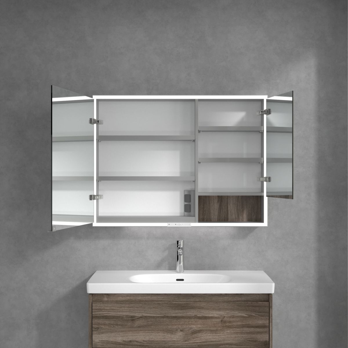 Banda LED care înconjoară oglinda asigură o iluminare uniformă, în timp ce iluminarea integrată a chiuvetei și compartimentele deschise iluminate creează o atmosferă confortabilă. Luminozitatea și temperatura culorii pot fi reglate comod folosind un senzor sau un controler Smart Home. Mânerele delicate permit deschiderea ușoară a ușilor fără a lăsa amprente, iar o priză dublă în mijloc oferă funcționalitate suplimentară.