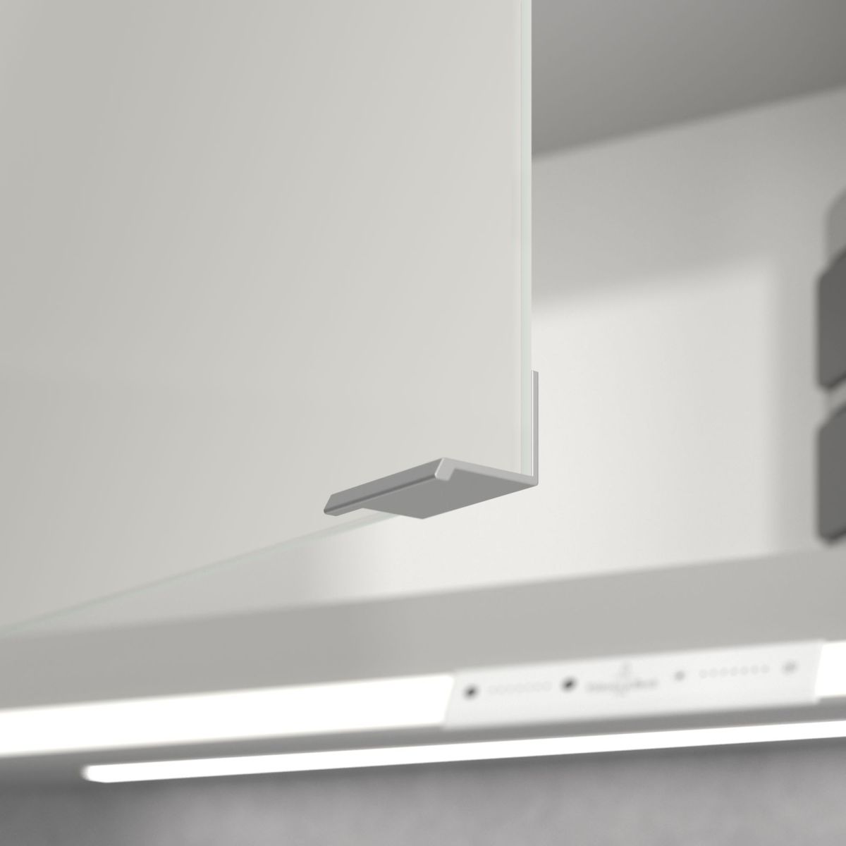 Banda LED care înconjoară oglinda asigură o iluminare uniformă, în timp ce iluminarea integrată a chiuvetei și compartimentele deschise iluminate creează o atmosferă confortabilă. Luminozitatea și temperatura culorii pot fi reglate comod folosind un senzor sau un controler Smart Home. Mânerele delicate permit deschiderea ușoară a ușilor fără a lăsa amprente, iar o priză dublă în mijloc oferă funcționalitate suplimentară.