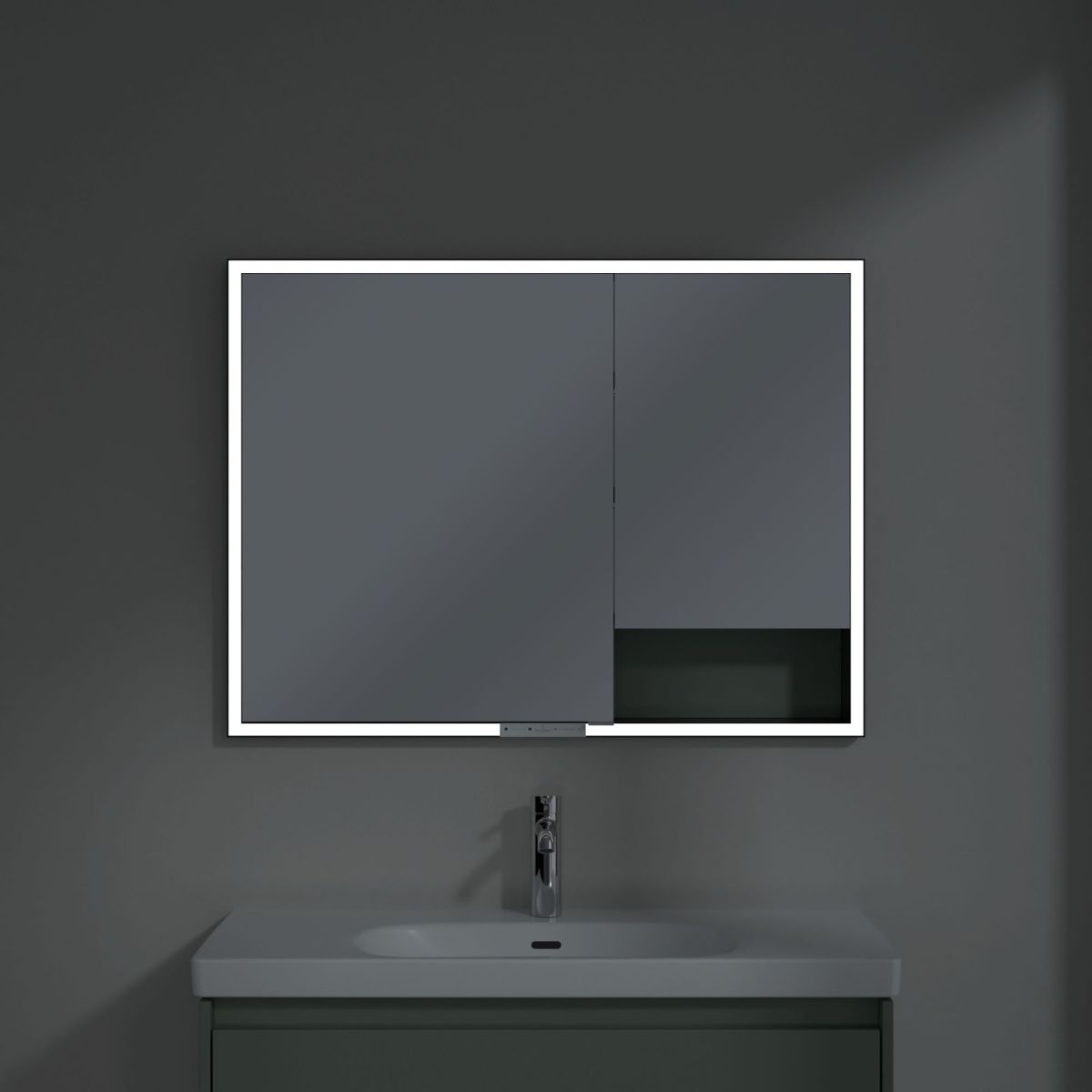 Banda LED care înconjoară oglinda asigură o iluminare uniformă, în timp ce iluminarea integrată a chiuvetei și compartimentele deschise iluminate creează o atmosferă confortabilă. Luminozitatea și temperatura culorii pot fi reglate comod folosind un senzor sau un controler Smart Home. Mânerele delicate permit deschiderea ușoară a ușii fără a lăsa amprente, iar o priză dublă în mijloc oferă funcționalitate suplimentară.