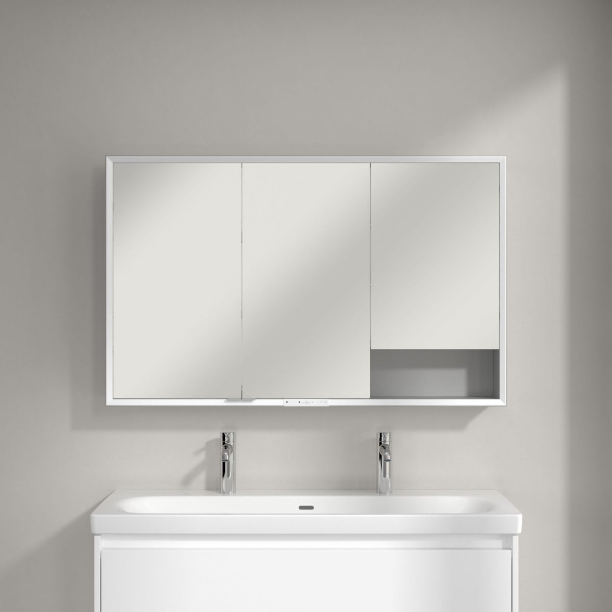 Pentru cei care au nevoie de și mai mult spațiu de depozitare, recomandăm combinarea dulapului cu oglindă My View+ cu mobilier suplimentar pentru baie – colecția de mobilier Skyla de la Villeroy & Boch se potrivește perfect din punct de vedere al designului și stilului. Așa arată un design modern și armonios pentru baie!