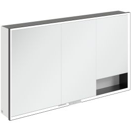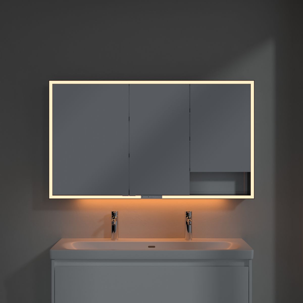 Banda LED care înconjoară oglinda asigură o iluminare uniformă, în timp ce iluminarea integrată a chiuvetei și compartimentele deschise iluminate creează o atmosferă confortabilă. Luminozitatea și temperatura culorii pot fi reglate comod folosind un senzor sau un controler Smart Home. Mânerele delicate permit deschiderea comodă a ușii fără a lăsa amprente, iar o priză dublă în mijloc oferă funcționalitate suplimentară.