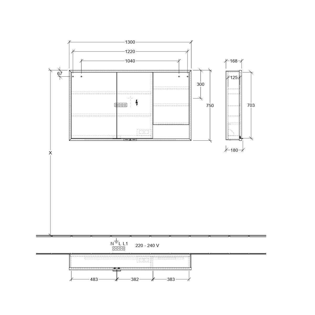 - accesorii: 3 x uși, 1 x comutator cu senzor în exterior, 2 x prize în interior, 4 x rafturi din aluminiu, 1 x compartiment de depozitare deschis în partea dreaptă jos, 1 x recipient, 1 x oglindă cu mărire, 1 x bandă magnetică