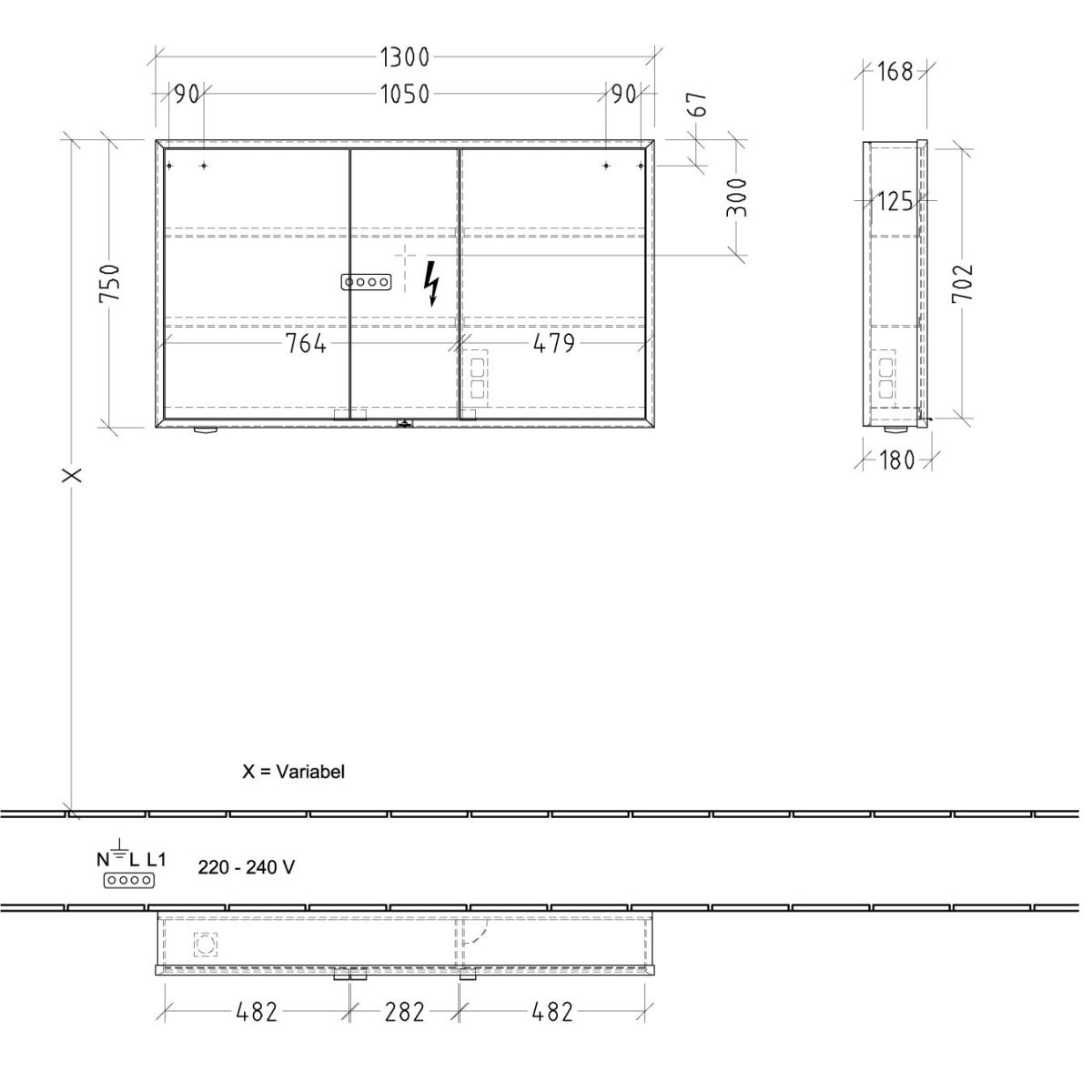 Banda LED care înconjoară oglinda asigură o iluminare uniformă, în timp ce iluminarea integrată a chiuvetei și compartimentele deschise iluminate creează o atmosferă confortabilă. Luminozitatea și temperatura culorii pot fi reglate comod folosind un senzor sau un controler Smart Home. Mânerele delicate permit deschiderea ușoară a ușilor fără a lăsa amprente, iar o priză dublă în mijloc oferă funcționalitate suplimentară.