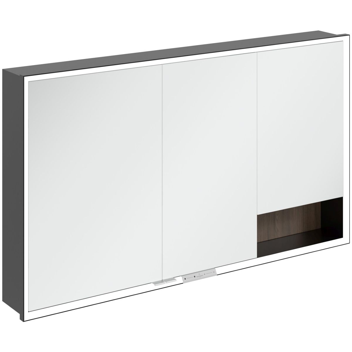 Banda LED care înconjoară oglinda asigură o iluminare uniformă, în timp ce iluminarea integrată a chiuvetei și compartimentele deschise iluminate creează o atmosferă confortabilă. Luminozitatea și temperatura culorii pot fi reglate comod folosind un senzor sau un controler Smart Home. Mânerele delicate permit deschiderea ușoară a ușilor fără a lăsa amprente, iar o priză dublă în mijloc oferă funcționalitate suplimentară.