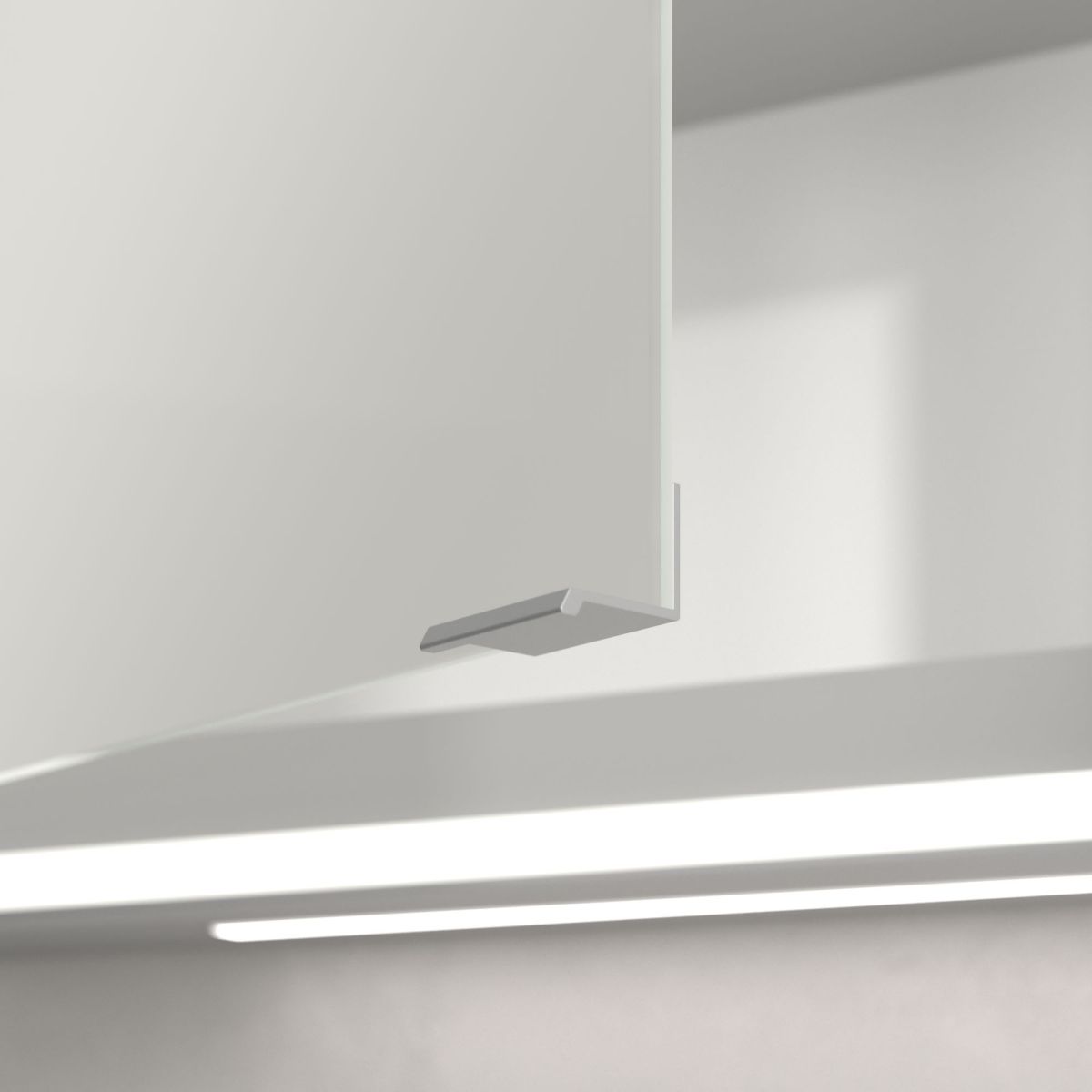 Banda LED care înconjoară oglinda asigură o iluminare uniformă, în timp ce iluminarea integrată a chiuvetei și compartimentele deschise iluminate creează o atmosferă confortabilă. Luminozitatea și temperatura culorii pot fi reglate comod folosind un senzor sau un controler Smart Home. Mânerele delicate permit deschiderea ușoară a ușilor fără a lăsa amprente, iar o priză dublă în mijloc oferă funcționalitate suplimentară.