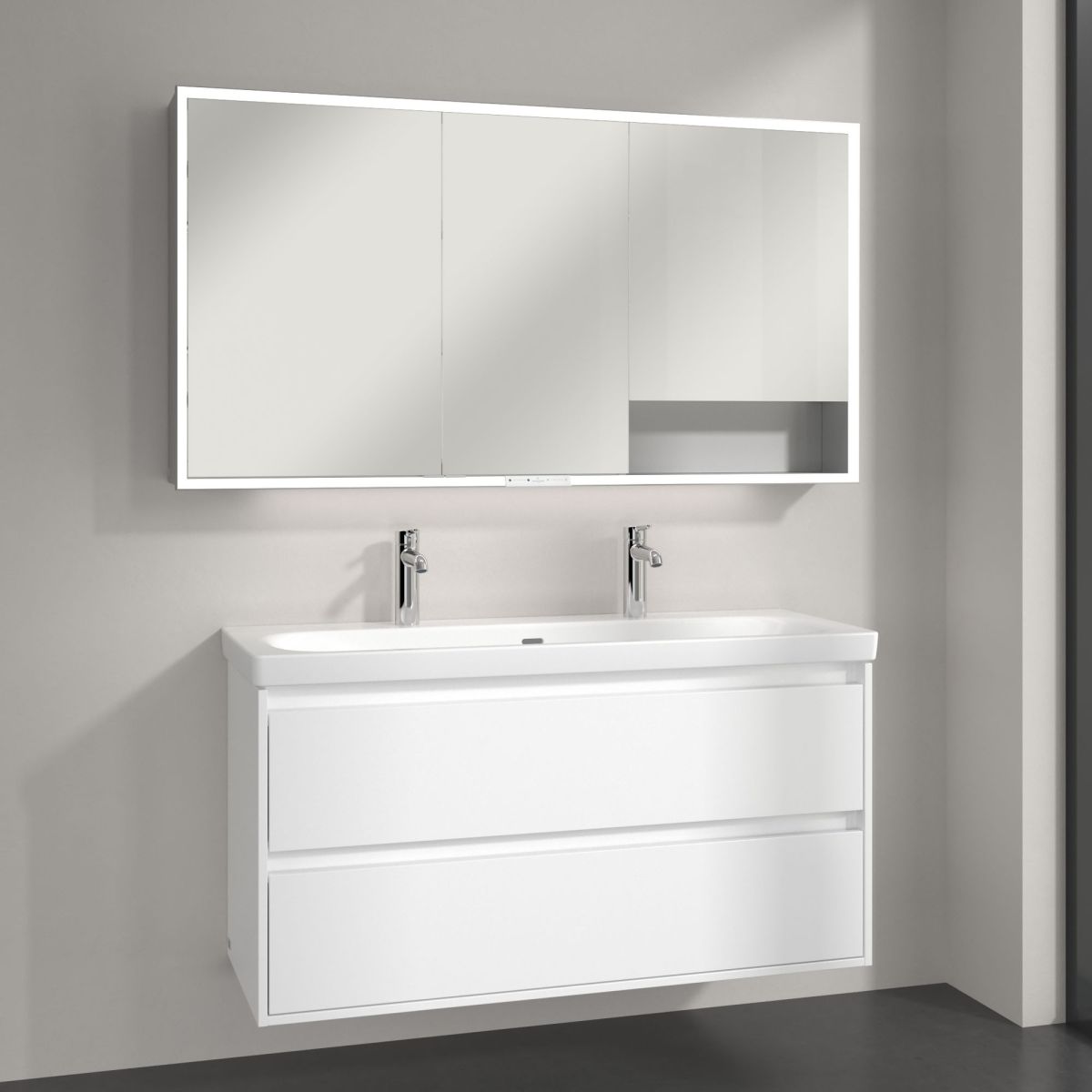 Pentru cei care au nevoie de și mai mult spațiu de depozitare, recomandăm combinarea dulapului cu oglindă My View+ cu mobilier suplimentar pentru baie – colecția de mobilier Skyla de la Villeroy & Boch se potrivește perfect din punct de vedere al designului și stilului. Așa arată un design modern și armonios pentru baie!