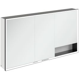 Banda LED care înconjoară oglinda asigură o iluminare uniformă, în timp ce iluminarea integrată a chiuvetei și compartimentele deschise iluminate creează o atmosferă confortabilă. Luminozitatea și temperatura culorii pot fi reglate comod folosind un senzor sau un controler Smart Home. Mânerele delicate permit deschiderea ușoară a ușilor fără a lăsa amprente, iar o priză dublă în mijloc oferă funcționalitate suplimentară.