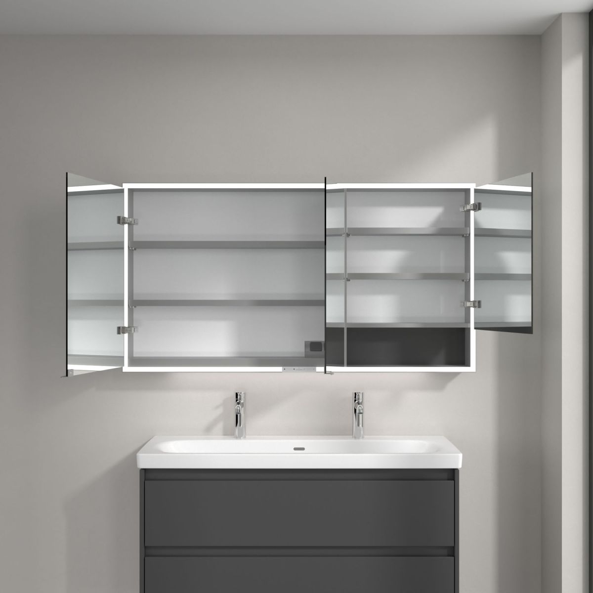 Banda LED care înconjoară oglinda asigură o iluminare uniformă, în timp ce iluminarea integrată a chiuvetei și compartimentele deschise iluminate creează o atmosferă confortabilă. Luminozitatea și temperatura culorii pot fi reglate comod folosind un senzor sau un controler Smart Home. Mânerele delicate permit deschiderea ușoară a ușilor fără a lăsa amprente, iar o priză dublă în mijloc oferă funcționalitate suplimentară.