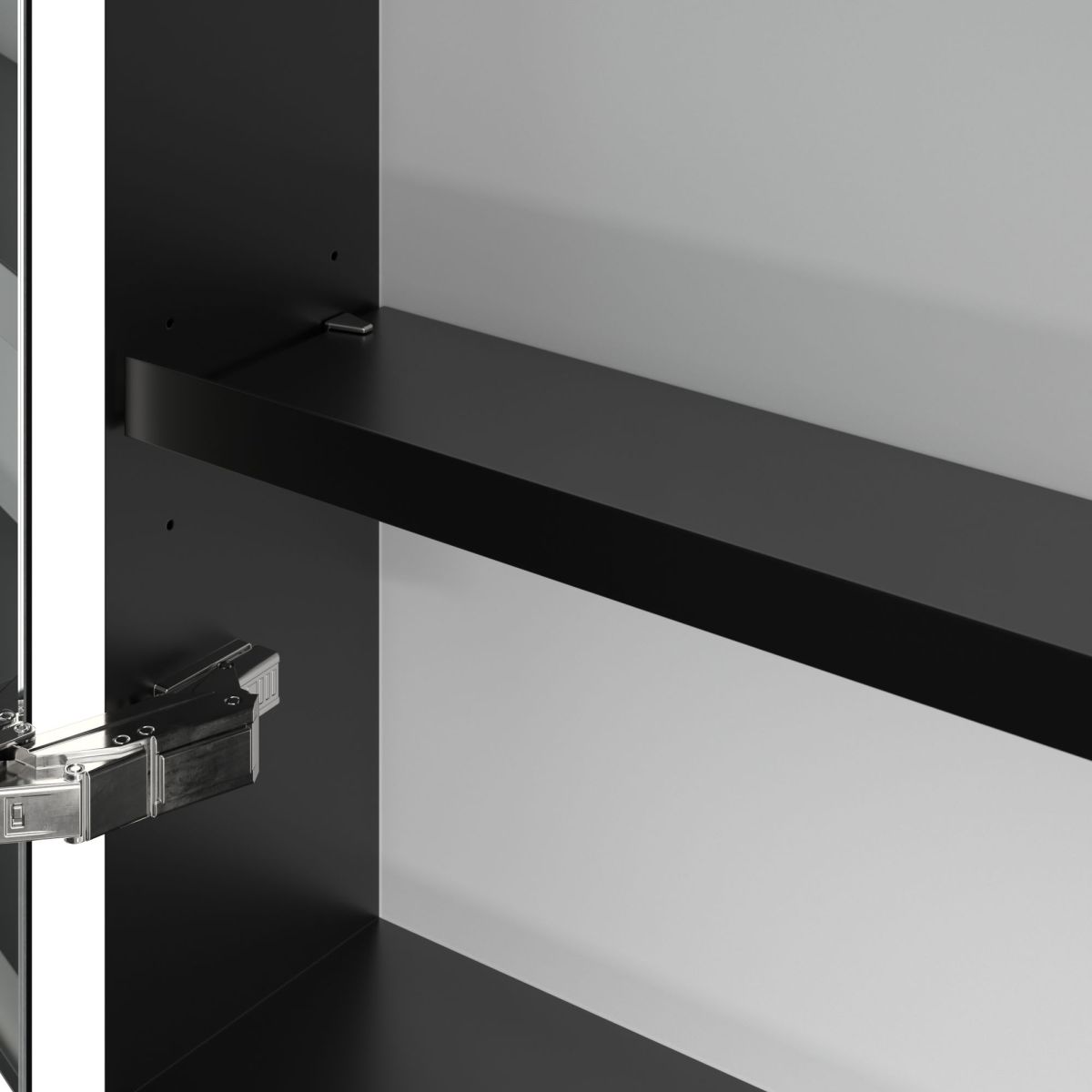Banda LED care înconjoară oglinda asigură o iluminare uniformă, în timp ce iluminarea integrată a chiuvetei și compartimentele deschise iluminate creează o atmosferă confortabilă. Luminozitatea și temperatura culorii pot fi reglate comod folosind un senzor sau un controler Smart Home. Mânerele delicate permit deschiderea ușoară a ușilor fără a lăsa amprente, iar o priză dublă în mijloc oferă funcționalitate suplimentară.