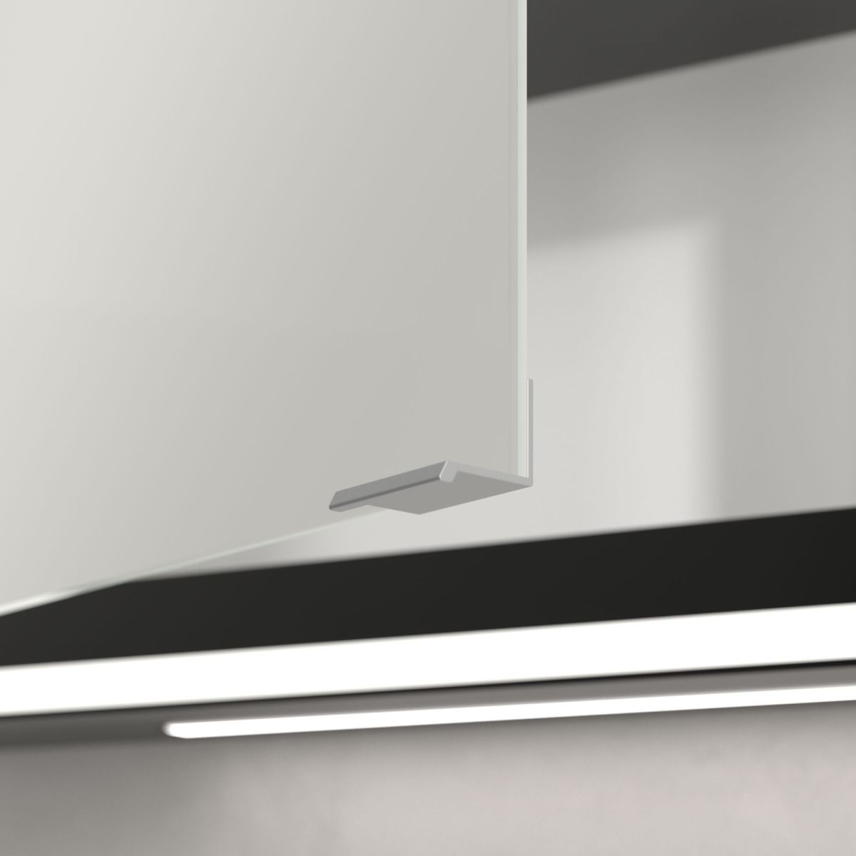 Banda LED care înconjoară oglinda asigură o iluminare uniformă, în timp ce iluminarea integrată a chiuvetei și compartimentele deschise iluminate creează o atmosferă confortabilă. Luminozitatea și temperatura culorii pot fi reglate comod folosind un senzor sau un controler Smart Home. Mânerele delicate permit deschiderea ușoară a ușilor fără a lăsa amprente, iar o priză dublă în mijloc oferă funcționalitate suplimentară.