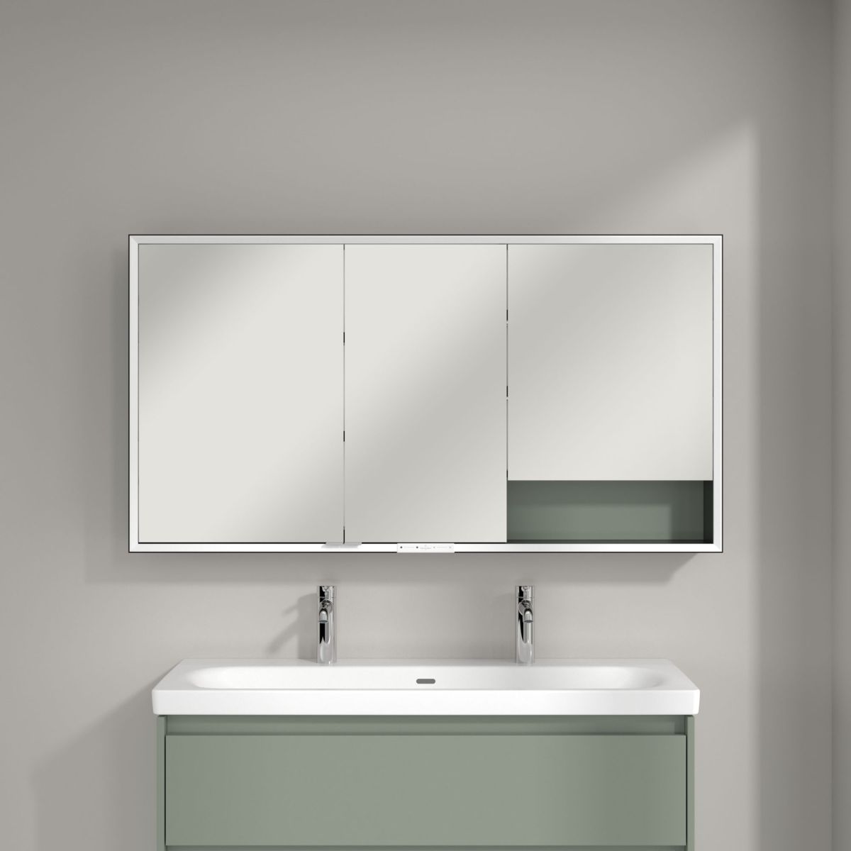 O soluție ingenioasă și atractivă pentru băile minimaliste – dulapul cu oglindă încorporată My View+ de la Villeroy & Boch introduce caracteristici inteligente și accente de culoare elegante în baie, stabilind noi standarde. Dulapul cu compartimente de depozitare închise și compartimente deschise se integrează perfect în perete și creează un efect minimalist deosebit de elegant. Panoul posterior colorat adaugă o notă individuală de culoare și design băii.