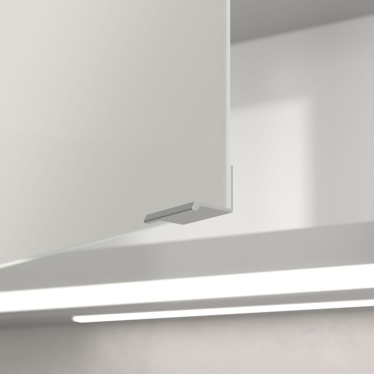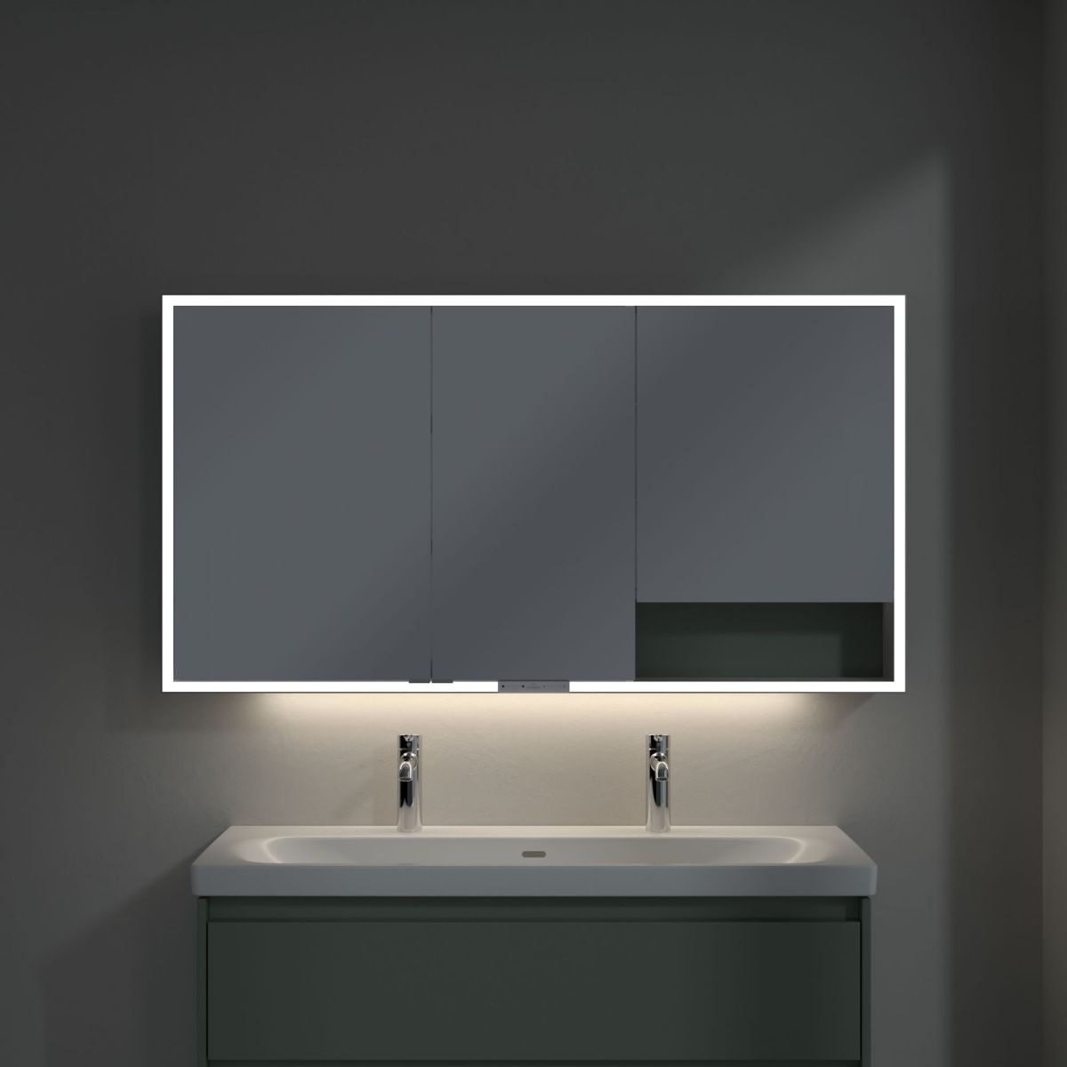 Banda LED care înconjoară oglinda asigură o iluminare uniformă, în timp ce iluminarea integrată a chiuvetei și compartimentele deschise iluminate creează o atmosferă confortabilă. Luminozitatea și temperatura culorii pot fi reglate comod folosind un senzor sau un controler Smart Home. Mânerele delicate permit deschiderea ușoară a ușilor fără a lăsa amprente, iar o priză dublă în mijloc oferă funcționalitate suplimentară.