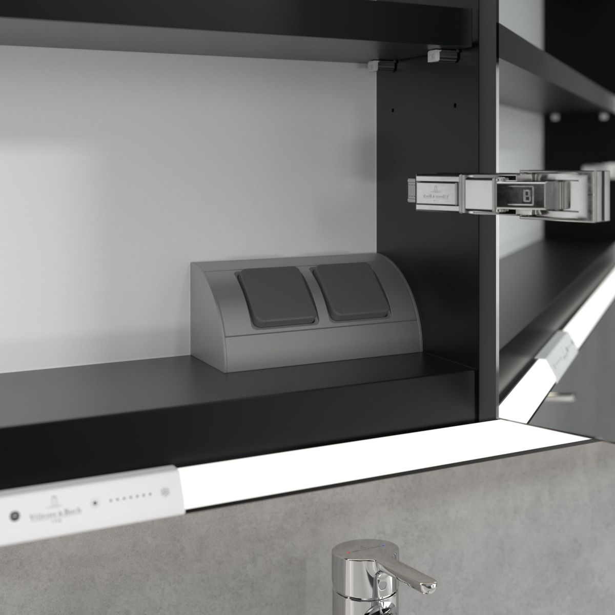 Banda LED care înconjoară oglinda asigură o iluminare uniformă, în timp ce iluminarea integrată a chiuvetei și compartimentele deschise iluminate creează o atmosferă confortabilă. Luminozitatea și temperatura culorii pot fi reglate comod folosind un senzor sau un controler Smart Home. Mânerele delicate permit deschiderea ușoară a ușilor fără a lăsa amprente, iar o priză dublă în mijloc oferă funcționalitate suplimentară.