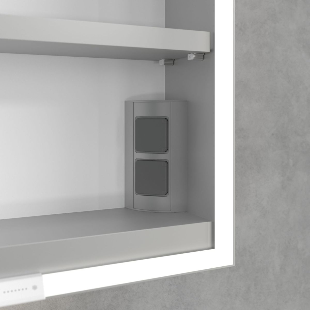 Banda LED care înconjoară oglinda asigură o iluminare uniformă, în timp ce iluminarea integrată a chiuvetei și compartimentele deschise iluminate creează o atmosferă confortabilă. Luminozitatea și temperatura culorii pot fi reglate comod folosind un senzor sau un controler Smart Home. Mânerele delicate permit deschiderea ușoară a ușilor fără a lăsa amprente, iar o priză dublă în mijloc oferă funcționalitate suplimentară.