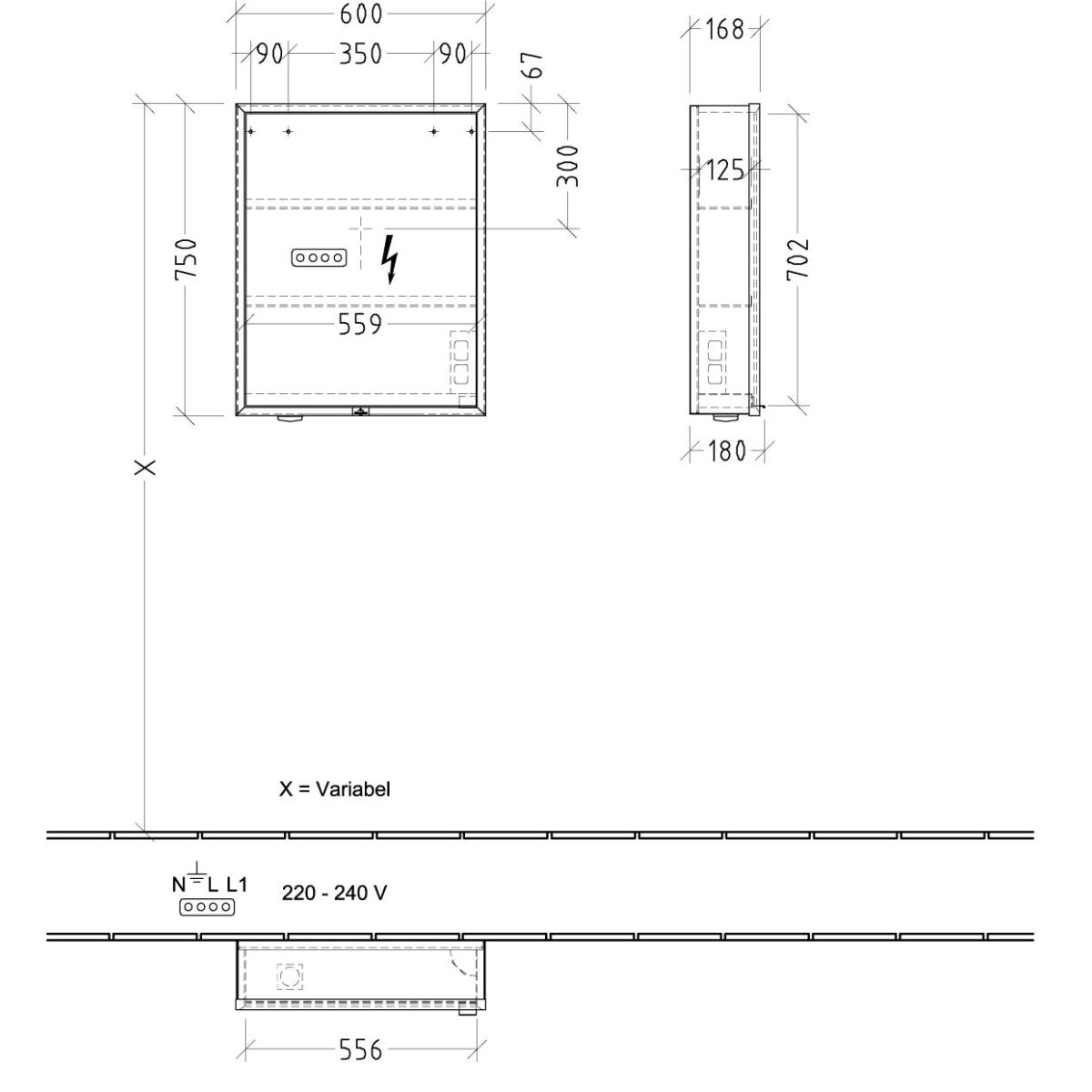 - accesorii: 1 x ușă, 1 x comutator senzor extern, 2 x prize interne, 4 x rafturi din aluminiu, 1 x compartiment de depozitare deschis în partea dreaptă jos, 1 x recipient, 1 x oglindă cu mărire, 1 x bandă magnetică- material corp: aluminiu