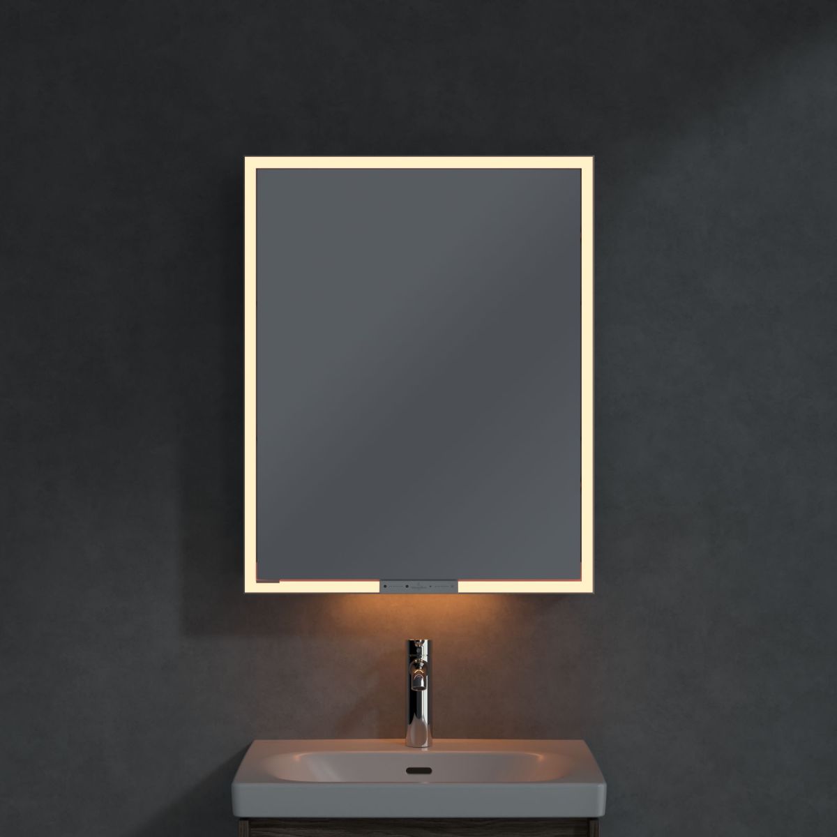 Banda LED care înconjoară oglinda asigură o iluminare uniformă, în timp ce iluminarea integrată a chiuvetei și compartimentele deschise iluminate creează o atmosferă confortabilă. Luminozitatea și temperatura culorii pot fi reglate comod folosind un senzor sau un controler Smart Home. Mânerele delicate permit deschiderea ușoară a ușilor fără a lăsa amprente, iar o priză dublă în mijloc oferă funcționalitate suplimentară.