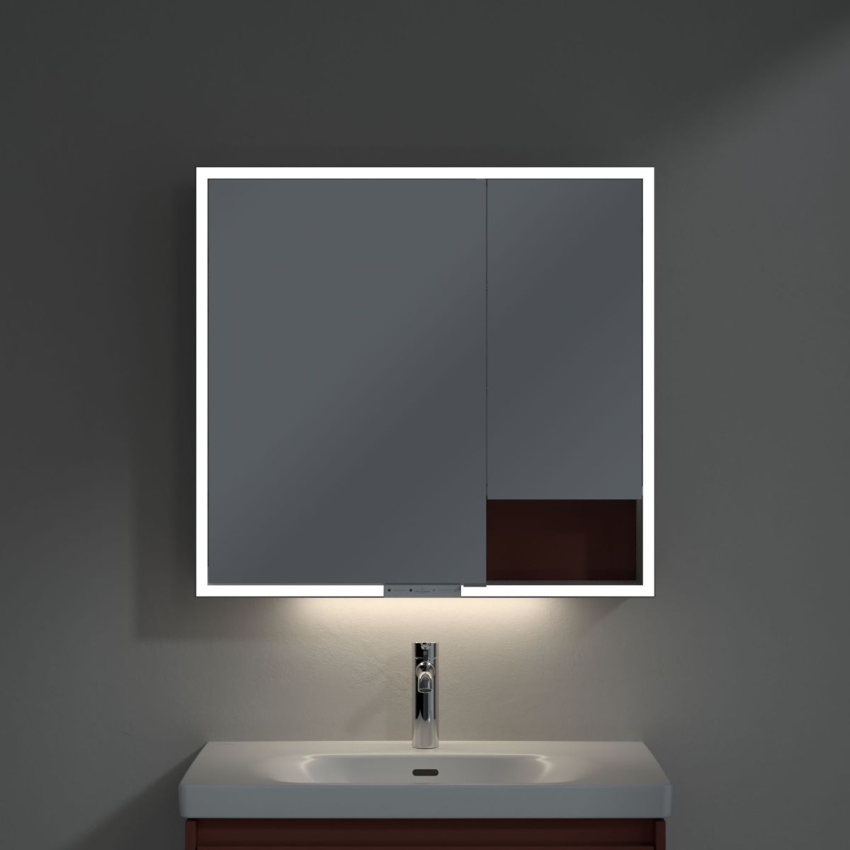 Banda LED care înconjoară oglinda asigură o iluminare uniformă, în timp ce iluminarea integrată a chiuvetei și compartimentele deschise iluminate creează o atmosferă confortabilă. Luminozitatea și temperatura culorii pot fi reglate comod folosind un senzor sau un controler Smart Home. Mânerele delicate permit deschiderea confortabilă a ușilor fără a lăsa amprente, iar o priză dublă în mijloc oferă funcționalitate suplimentară.