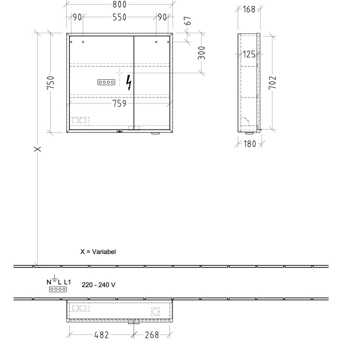 - accesorii: 2 uși, 1 comutator senzor extern, 2 prize interne, 4 rafturi din aluminiu, 1 compartiment de depozitare deschis în partea dreaptă jos, 1 recipient, 1 oglindă cu mărire, 1 bandă magnetică- material corp: aluminiu