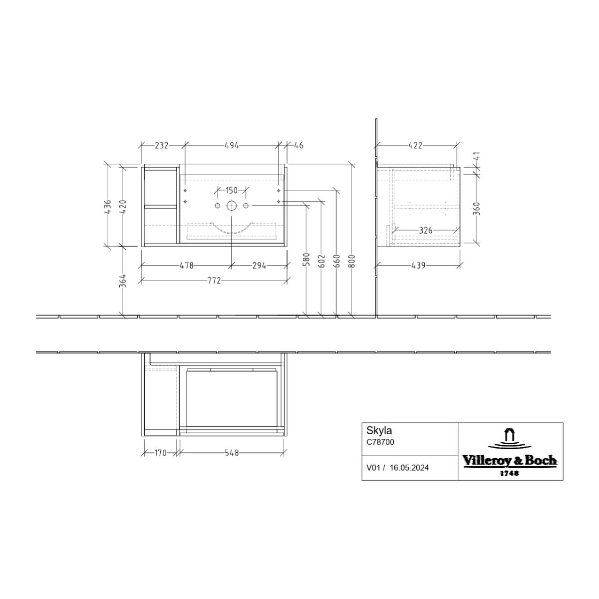 Villeroy & Boch Skyla dulap 77.2x43.9x43.6 cm sub chiuveta pe perete stejar C78700VH