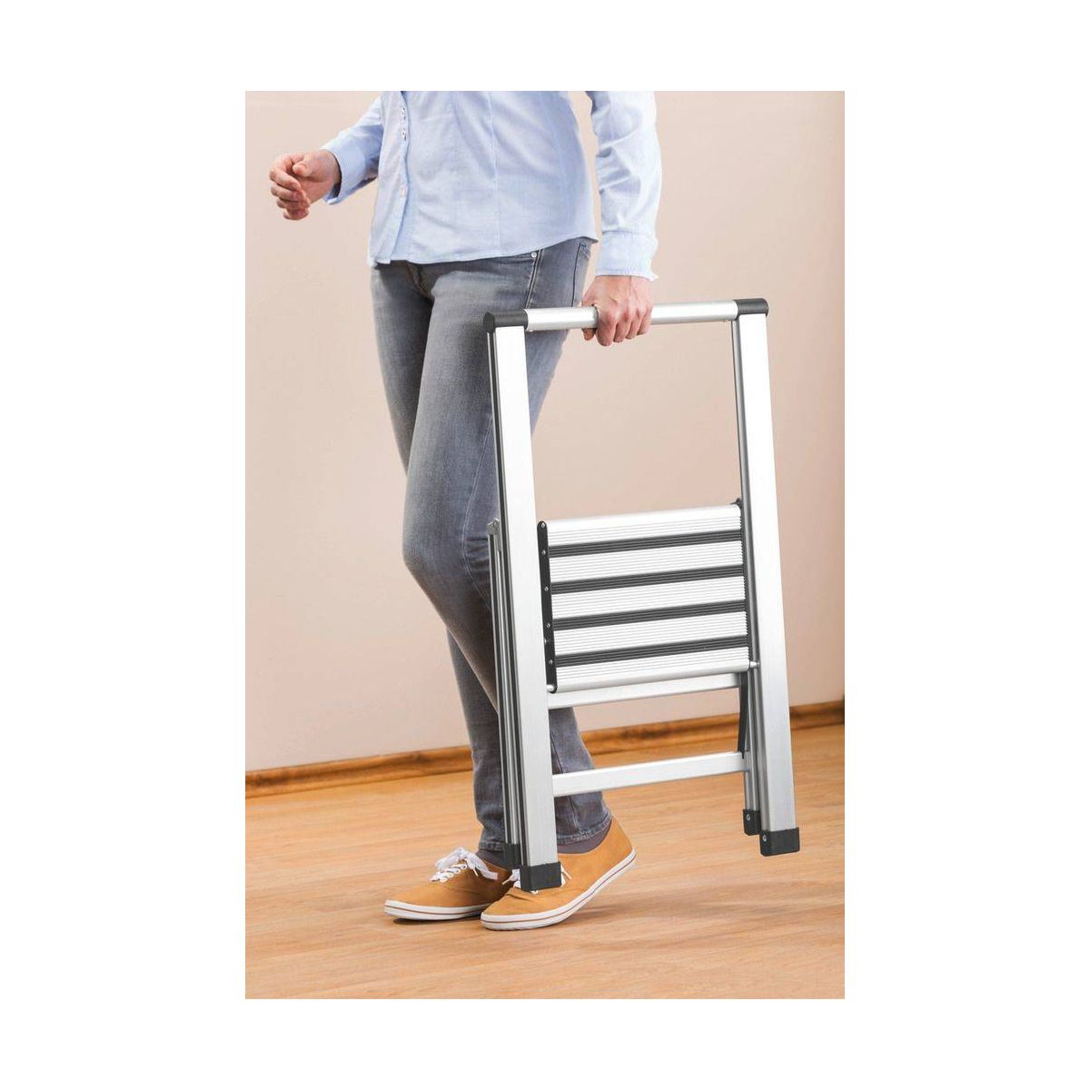 Scara cu două trepte, cu o suprafață antiderapantă, permite atingerea în siguranță a lucrurilor la înălțime. De asemenea, poate face mai ușoare treburile casnice, cum ar fi curățarea ferestrelor.